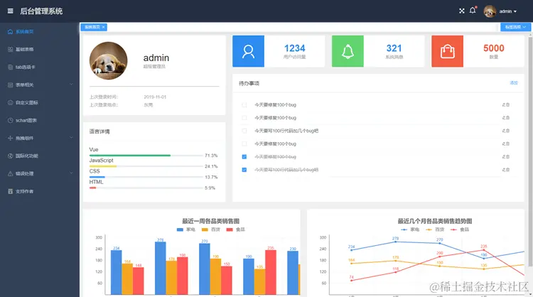 适用于绝大部分后台管理系统开发的多功能框架模板,基于Vue.js和Element UI组件库,支持手动切换主题色和自定义主题色。Github上已被Star18.2k,V 哥觉得整体风格还不错,兄弟们做项目也可以考虑。