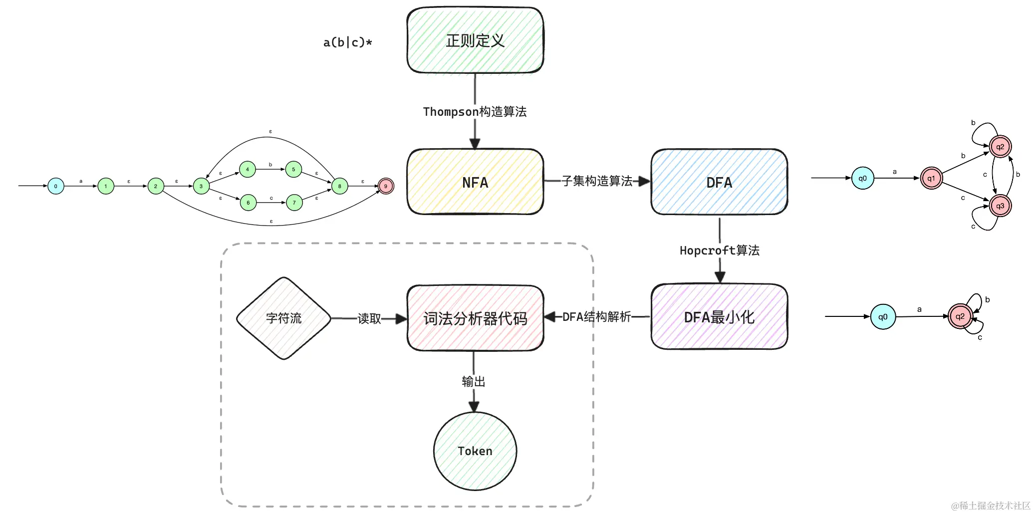 词法分析器的核心逻辑基于有限自动机(Finite Automata),可以理解为有限个状态的自动执行机器,用来将扫描得到的字符映射到有限个的可能性上。类型包括: