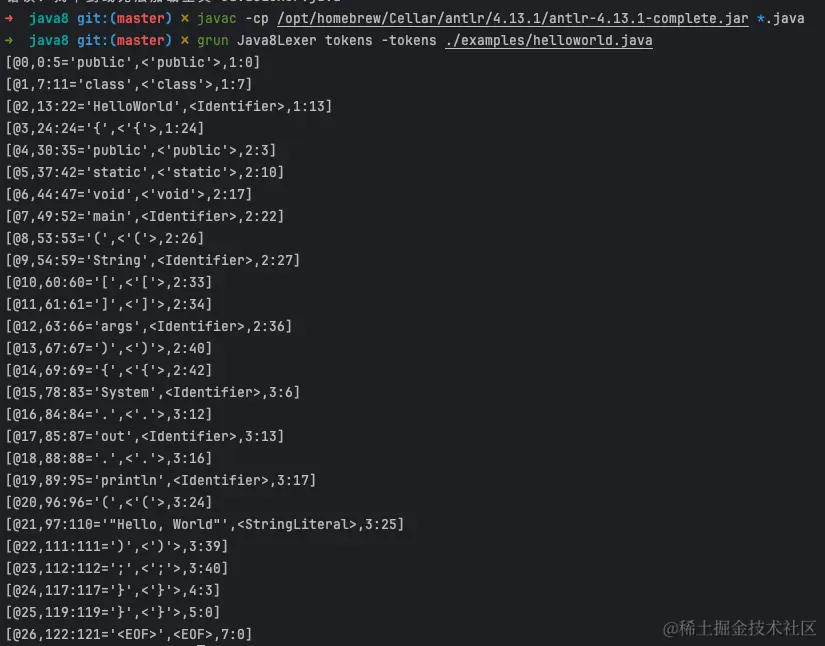 grun Java8Lexer tokens -tokens ./examples/helloworld.java