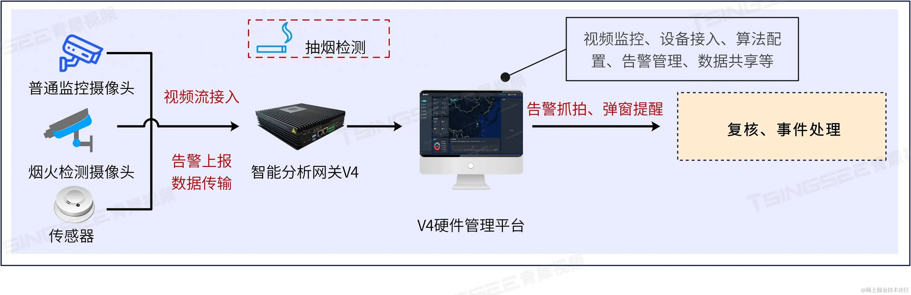 TSINGSEE青犀AI智能分析网关V4抽烟检测AI算法可以基于监控摄像头接入的视频流,自动检测画面内是否有人员抽烟,检测到抽烟行为将立即抓拍并告警。