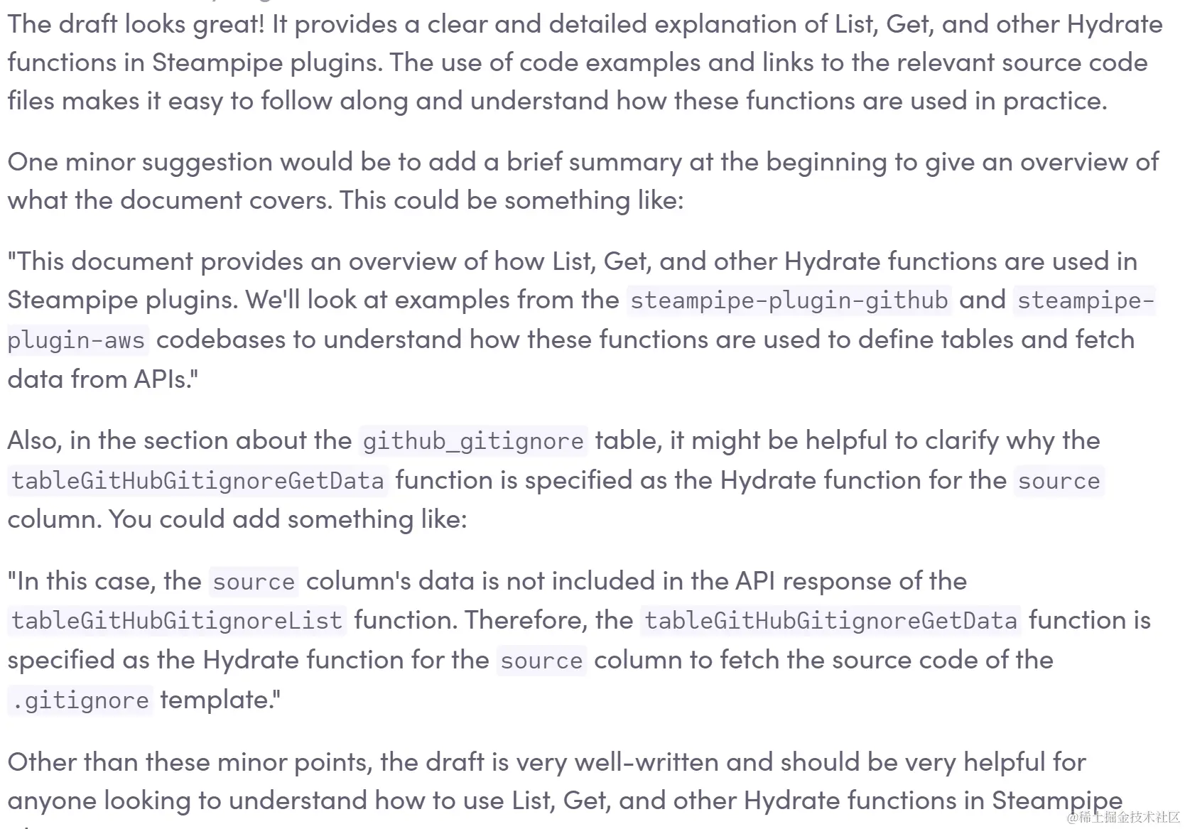 这是我重新审视我们 2022 年文档冲刺的机会,并配备了我希望当时拥有的工具。我们的目标之一是用 SDK 惯例的示例丰富文档,并链接到可以在其中按上下文查看这些示例的源代码。Unblock 查找此类示例的能力可能是它在此次重写期间提供的最大好处。有一次,我正在寻找使用 List 函数(它使用主 API 调用的结果填充 Steampipe 表的某些列)和 Hydrate 函数(它使用辅助 API 调用的结果填充其他列)的混合的插件代码示例。“List”和“Hydrate”这两个词无处不在:在插件 SDK 本身的代码中,以及每个插件的代码中。如果你正在寻找一个结合这两种函数的示例,传统的代码搜索是无望的。但你可以向 Unblocked 提出这样的问题: