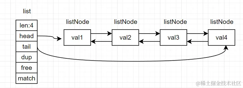 通过list 结构可以很方便地取到链表的头节点、尾节点以及链表长度。dup 、 free 和 match 属性是用于实现多态链表所需的类型特定函数,具体地,dup 函数用于复制链表节点所保存的值;free 函数用于释放链表节点所保存的值;match 函数则用于对比链表节点所保存的值和另一个输入值是否相等。使用list之后的链表结构如下: