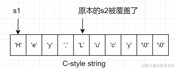 若直接调用C函数strcat(s1, ",Lucy"),企图将s1的内容修改为"Hey,Lucy",这样做确实能达到目的。然而,这种方式是错误的,正确的方式应该是在调用strcat()之前为s1分配足够的空间,而不是不经检查地直接调用。因为这种方式会导致s2被覆盖,称之为缓冲区溢出现象,如下图所示: