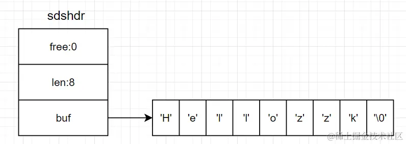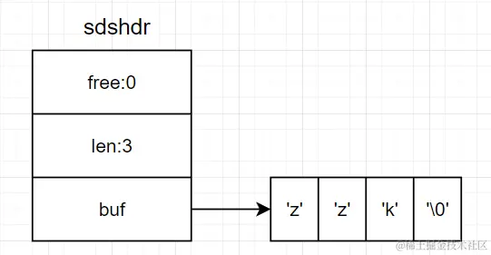 在这个SDS对象中,buf是一个char数组,其数组内容为:'z','z','k'和末尾的'\0'。free为0表示没有多余的字节可供使用,len为3表示这个SDS的字符串长度为3(与C字符串长度定义一样,不包括末尾的'\0')