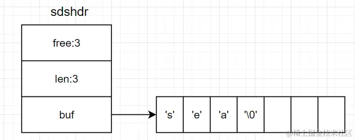 在这个SDS对象中,buf数组的内容为"sea"(末尾还有个'\0'),len为3表示这个SDS的字符串长度为3,而free为3表示这个buf数组还有3个字节未被使用。