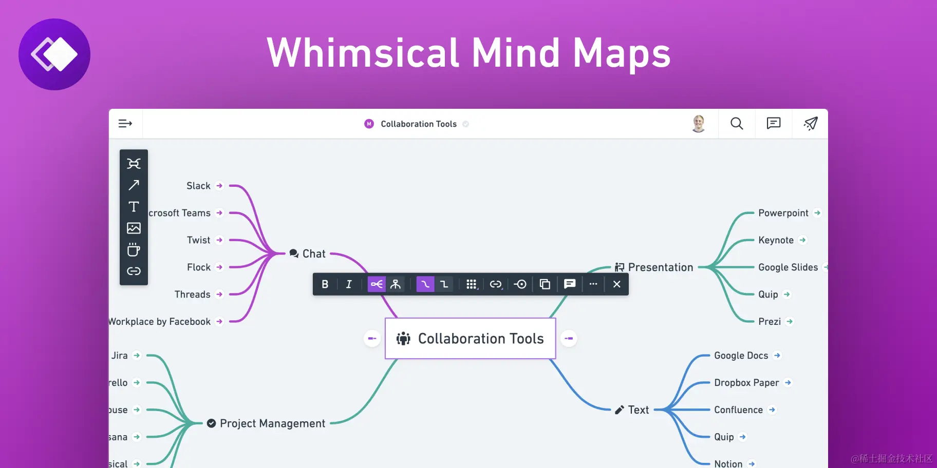 Whimsical 是一款充满活力和创意的在线思维导图软件,它以其直观的用户界面和丰富的视觉元素而受到设计师和创意专业人士的喜爱。这款软件不仅提供了思维导图功能,还整合了流程图、原型图等多种设计工具,使得用户可以在一个平台上完成多样化的设计任务。