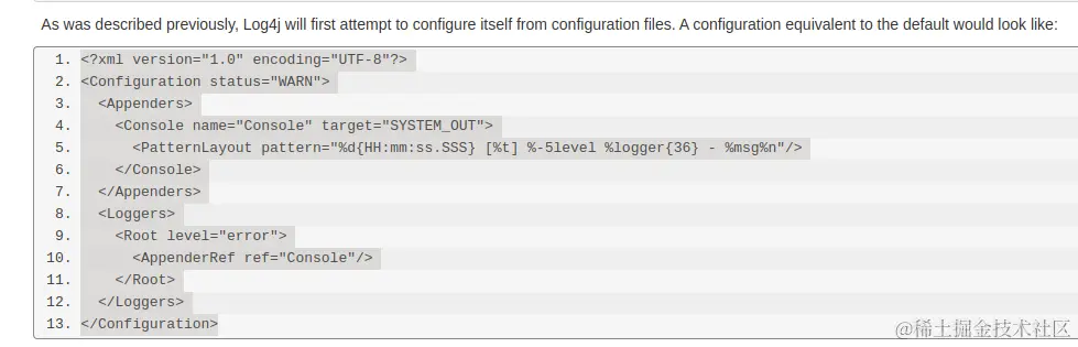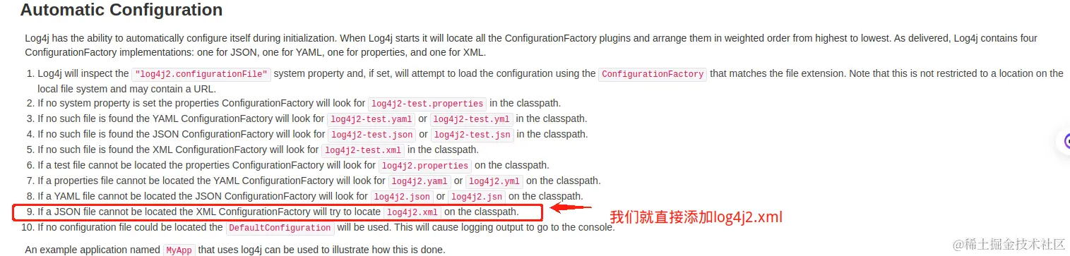 Log4j具有在初始化期间自配置的能力。当Log4j启动时,它将定位所有ConfigurationFactory插件,并按照从从高到低的加权顺序排列它们。交付时,Log4j包含四个ConfigurationFactory实现:一个用于JSON、一个用于YAML、一个用于属性、一个用于XML。