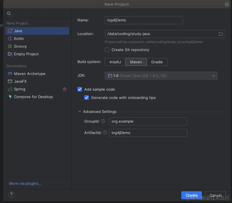 打开IDEA, 右上角点击: New Project,填写项目名称,构建工具选择: Maven,点击 Create
