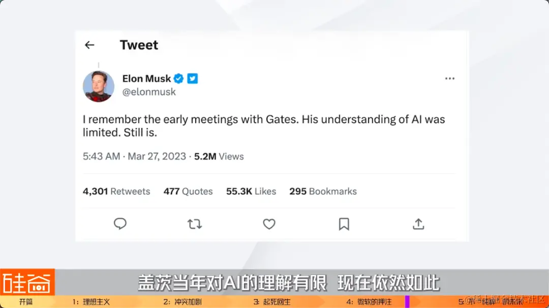 也就是说,OpenAI就算还不上钱了、或者分红很慢,也没关系,因为微软可以自己用AI赚回来。所以,不得不说,投资OpenAI的这步棋,Nadella走得真是太有远见了。而当年差点毙掉OpenAI投资的比尔-盖茨现在也开始自豪的讲述与OpenAI团队的接触故事,引发马斯克在推特上毫不留情地反怼说:“盖茨当年对AI的理解有限,现在依然如此”。