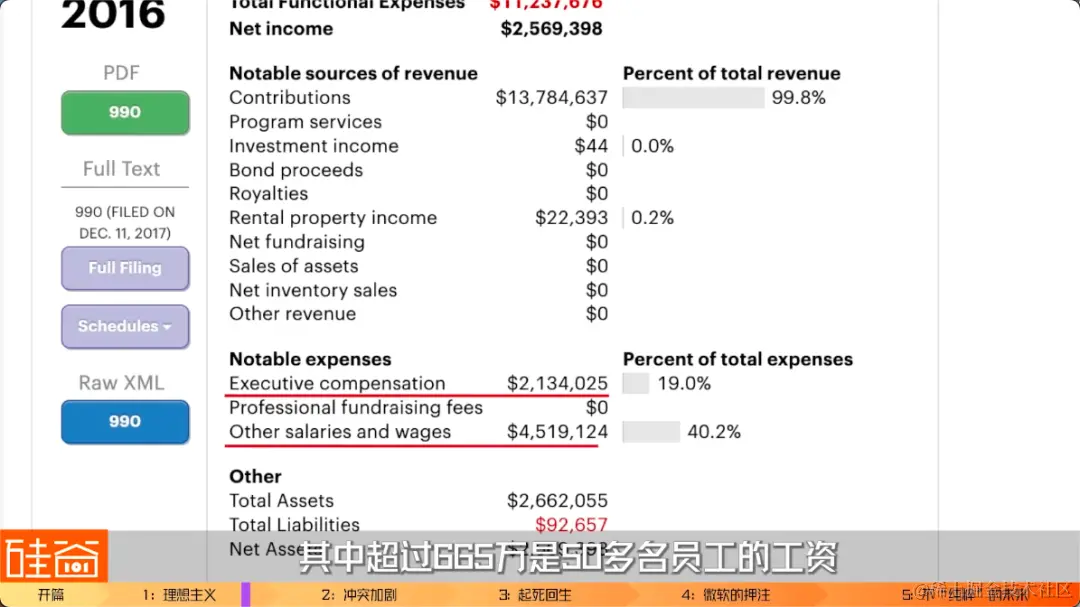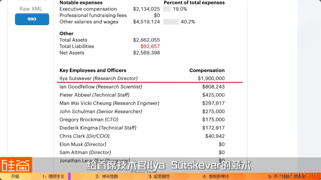 媒体报道原文是“Eclipsed the cost of a top quarterback prospect in the NFL”(超过了美国NFL橄榄球联赛中的顶尖四分卫的薪水),我平时不是橄榄球的粉丝不是很有概念,然后去查了一下,结果吓一跳:这些顶级橄榄球星的薪水都是几百万、上千万美元的,也就是说,最顶级的AI研究学者在科技巨头中的年薪也是这个价格,当然可能还包括股票啥的。而且,据其中一名研究员说,在得知他们有意向离开的时候,科技巨头们为了留住他们开出的新价格,是这个行业中已经如此高薪的工资的再2-3倍。但是,就算大公司们给出了这么极具诱惑力的年薪,十位受邀请的AI顶尖学者中,有九位都拒绝了高薪、加入了OpenAI。也不知道是不是Napa的红酒起了作用。OpenAI完全没有实力来match这么高的薪水,因为OpenAI最开始是非营利组织所以每年要公布支出。税务文件显示,给首席技术官Ilya Sutskever的薪水是大概190万美元,另外一个首席研究员Ian Goodfellow是80万美元,这两人都是从谷歌挖过来的,虽然当年他们的薪水公布之后是引发了一些舆论争议,觉得在非营利组织里面这个公司太高了。但是,我们要知道,他们从谷歌出来加入OpenAI,这个薪水下降得不是一点半点。我把OpenAI的历年报税表给找出来了,上面有蛮多有意思的信息的。