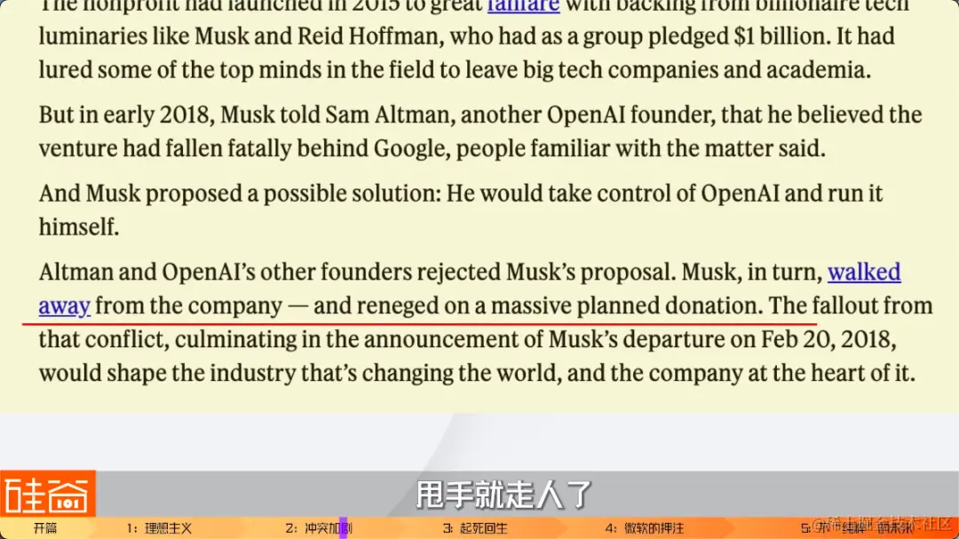 稍微说一句哈,以上提到的产品,技术和模型如果大家听得有点云里雾里,没关系,我们之后的大模型系列会专门详细说说这些技术的进化。反正今天这个视频里,大家知道,2018年底之前,谷歌都全面碾压OpenAI就可以了。这个时候,业界对OpenAI各种不看好,之前好不容易请来的很多技术大佬,不少又回谷歌脸书这些大厂了,公司面临着严重的人才流失、军心不稳。在2018年的时候,我们的马斯克大佬就坐不住了。气势汹汹来问罪说:你们都在干嘛,烧了钱出不来活儿,说好的要领先谷歌率先达到AGI呢,结果落后这么多!对马斯克熟悉的观众们都知道,马斯克是非常有占有欲和掌控欲的,根据科技媒体Semafor的信源爆料,马斯克就直接向OpenAI的董事会提议,我要全面接管OpenAI,我来当CEO。但是在2018年那会儿,大家可能还记得,马斯克他本人已经被特斯拉搞得焦头烂额,当时Model3又遭遇了生产地狱、被市场疯狂做空、质疑很快就要破产了,而马斯克每天就睡特斯拉工厂里。就这样,马斯克还想再全部接管OpenAI这个完全不同赛道的AI实验室,OpenAI的董事会肯定觉得不靠谱,就拒绝了马斯克的提案。于是,Semafor和Wired杂志等媒体报道,马斯克非常不爽,甩手就走人了。