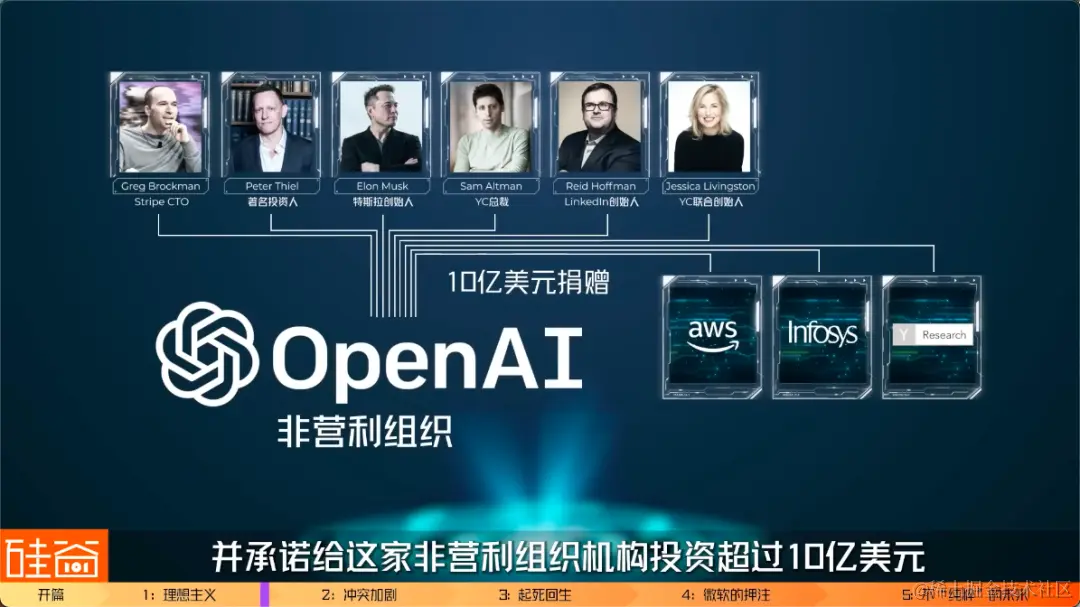 而这些放弃高薪的顶尖科学家们,加入这样的一个充满巨大不确定性的非营利组织,没有股权没有慷慨福利没有豪华年会没有明确的升值路径,其实就是因为一个很纯粹的目的聚在一起。这个目的,也写在了OpenAI的创立章程中:确保通用人工智能(AGI)造福全人类。2015年底,我们上面提到的YC总裁Sam Altman、Strip前CTO Greg Brockman、LinkedIn创始人Reid Hoffman、YC联合创始人Jessica Livingston、著名投资人Peter Thiel、特斯拉创始人Elon Musk、亚马逊AWS、Infosys公司和YC Research宣布成立OpenAI,并承诺给这家非营利组织机构投资超过 10 亿美元。由于OpenAI的非营利组织形式,没有人拥有公司任何股份或权益,而公司的财产和收入永远不会派发给任何捐赠人或业主。OpenAI表示,将通过向公众开放其专利和研究,并且会与其他机构和研究人员“自由合作”。