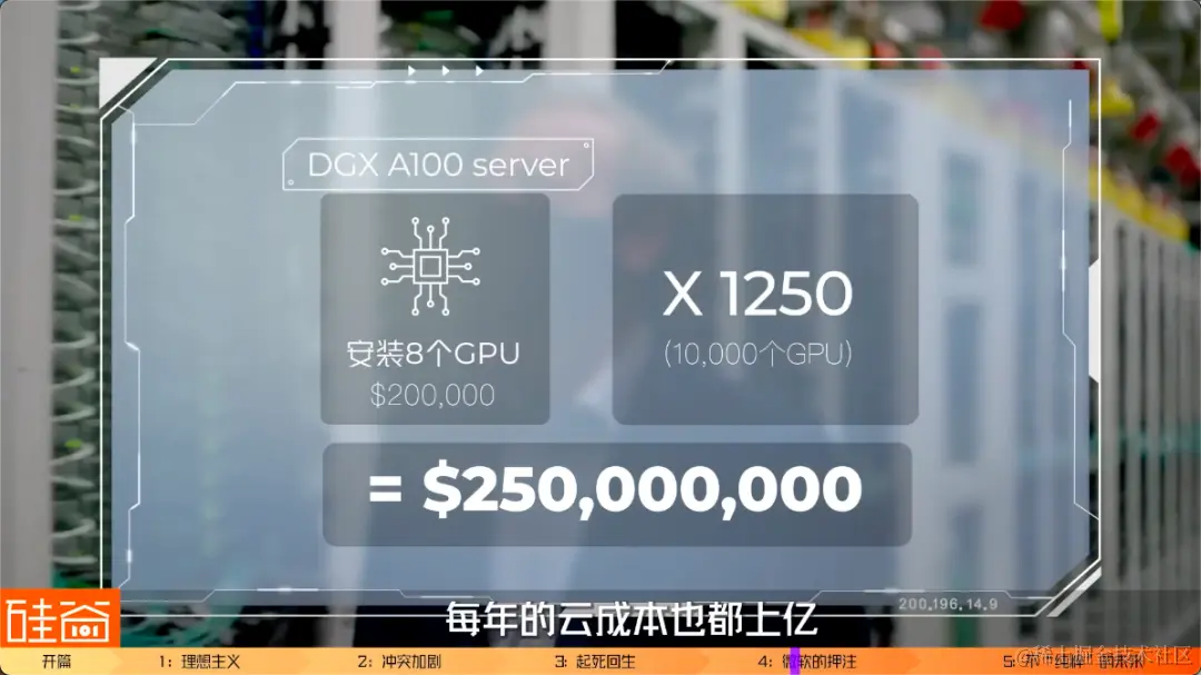 2019年发布的GPT-2有15亿的参数,2020年5月发布的GPT-3有1750亿的参数,每一次GPT的升级,参数量都是指数型的上升。后来训练ChatGPT的时候,CNBC报道,微软专门为OpenAI推出了一台全球前五的超级计算机,用了1万个英伟达的DGX A100 GPU。我稍微算了一下帐,每个DGX A100的server服务器上有8个GPU、卖价是20万美元,所以ChatGPT用了1250个A100 GPU服务器,也就是2.5亿美元。另外,训练一次大模型就要几百万美元,每年的云成本也都上亿。