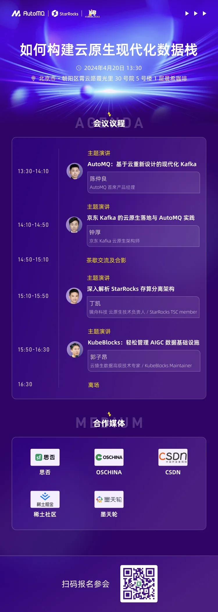 4 月 20 日,我们将联合 StarRocks、KubeBlocks 社区推出北京场 Meetup 活动。本次活动聚焦企业如何构建云原生现代化数据栈议题,邀请 AutoMQ 首席产品经理 陈仲良,京东 Kafka 云原生架构师 钟厚、镜舟科技云原生技术负责人 丁凯、云猿生数据高级技术专家 郭子昂等业界大咖,他们将结合自身的实践经验,多角度探讨云原生现代化数据栈在不同使用场景下的落地案例,涵盖现代化数据架构中,流处理领域的重要组件 Kafka 的实际案例及基于云重新设计的现代化 Kafka , AutoMQ 在京东的实际应用,还有数据库领域技术大咖带你剖析 StarRocks 的存算分离架构、KubeBlocks 如何管理 AIGC 数据基础设施。