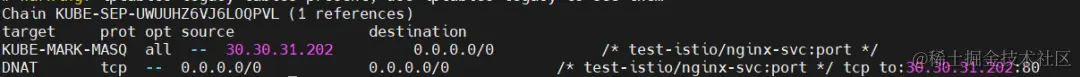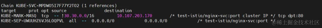 KUBE-SVC-MPDWO5I7F77Y2TO2 tcp -- 0.0.0.0/0 10.107.203.170 /* test-istio/nginx-svc:port cluster IP */ tcp dpt:80