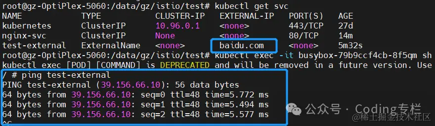 ExternalName 对应 DNS 的 CNAME,如果配置的ExternalName 可以 ping 通则 svc 可以 ping 通。