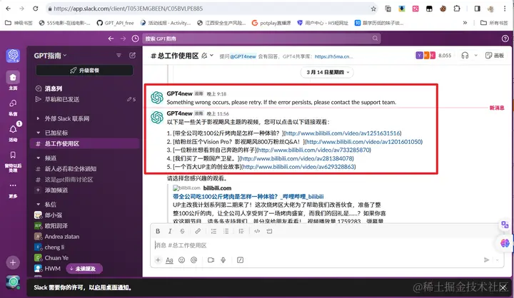 OpenAI官网是需要20美金一个月,但是有大神通过逆向工程。把GPT4-Turbo模型逆向到Slack,让大家免费使用,通过加入他的Slack工作区 @GPT4new应用即可使用GPT4-Turbo模型,可联网、可生图。目前Claude3 opus也可以在他工作区使用。