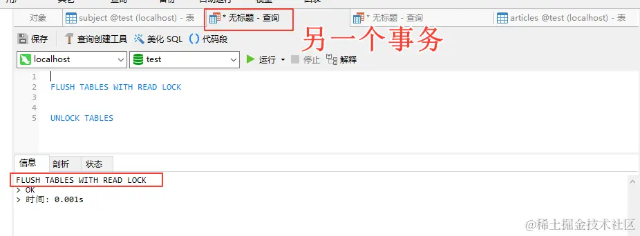 好的,我们去另一个事务中把库锁了: