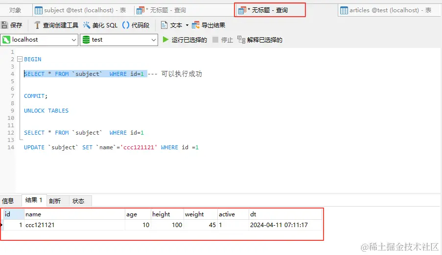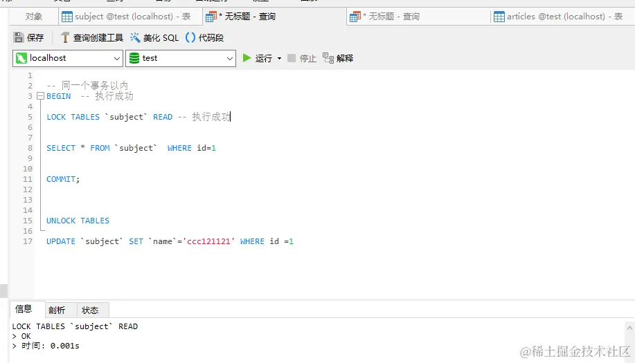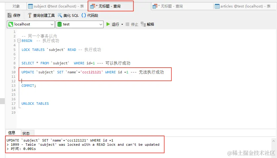 独占写锁:当一张表被上了共享读锁以后,当前事务既能读数据也能写数据,同时还能修改表结构,别的事务既不能读数据也不能写数据,必须等到该锁被释放以后才能读写数据。(验证方式和上面一样,不再给图了)