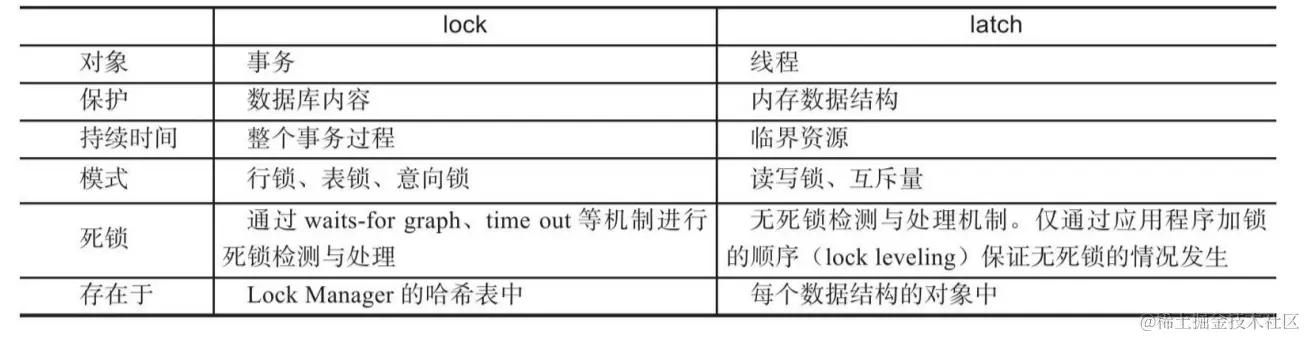 这里借用MySQL技术内幕中一张图,对比一下latch与lock的区别:
