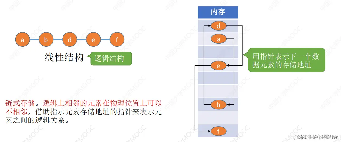 2)链式存储。 不要求逻辑上相邻的元素在物理位置上也相邻,借助指示元素存储地址的指针来表示元素之间的逻辑关系。其优点是不会出现碎片现象,能充分利用所有存储单;缺点是每个元素因存储指针而占用额外的存储空间,且只能实现顺序存取。