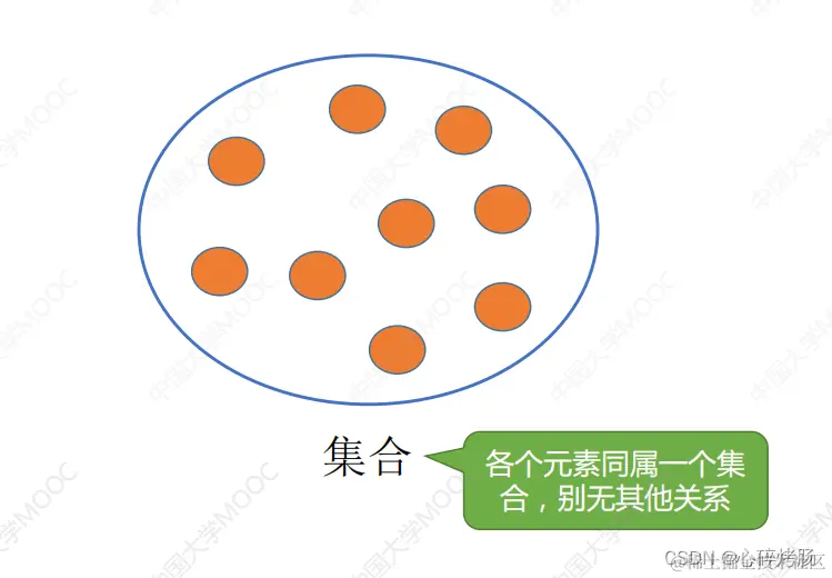 1)集合: 结构中的数据元素之间除“同属一个集合”外,别无其他关系;