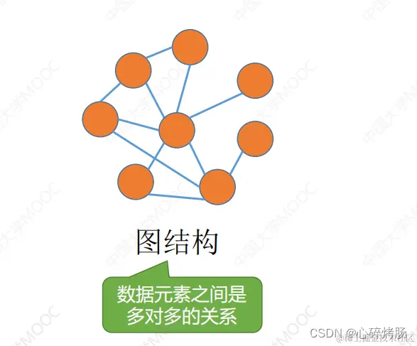 4)图状结构或网状结构: 结构中的数据元素之间存在多对多的关系;