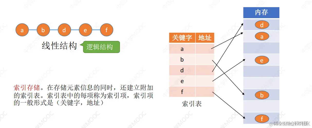 3)索引存储。 在存储元素信息的同时,还建立附加的索引表。索引表中的每项称为索引项,