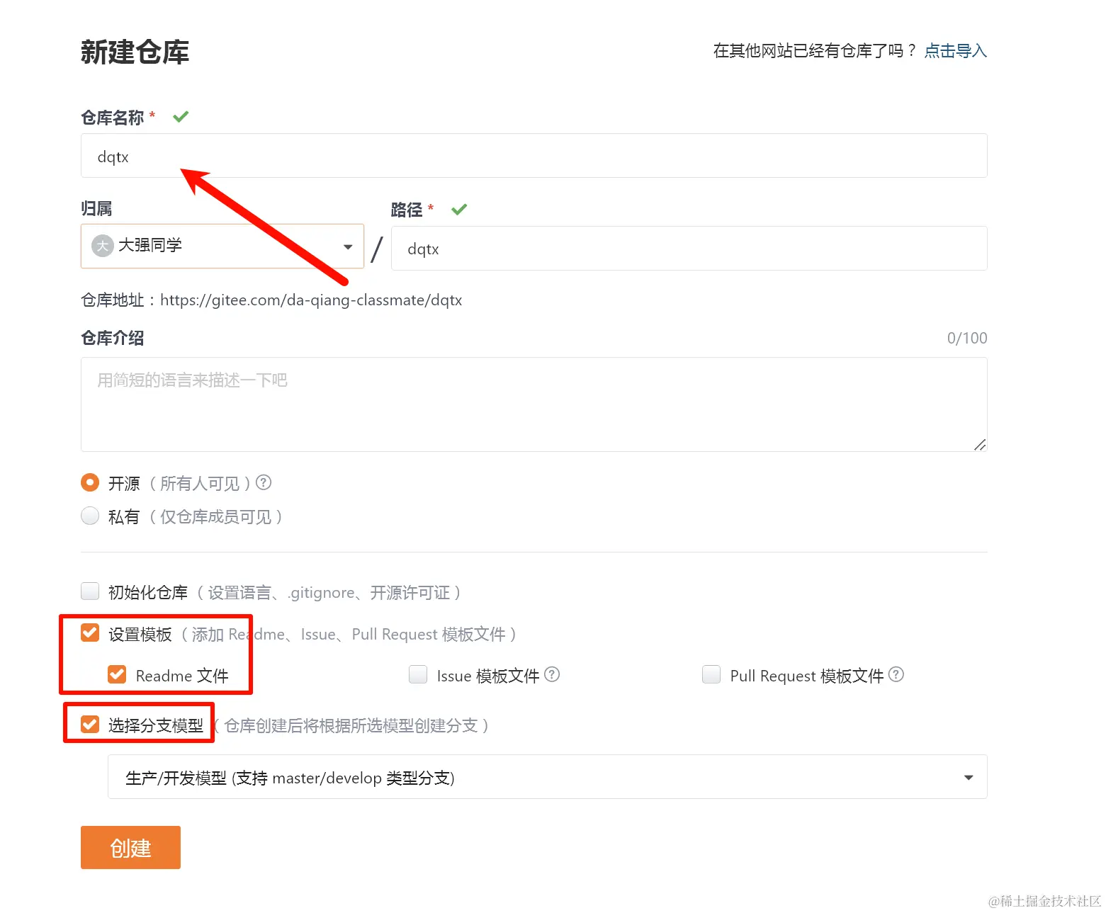 打开这个网站注册个账号,点击右上方+号,选择新建仓库,设置模板与选择分支模型打勾,然后做如下图选择。