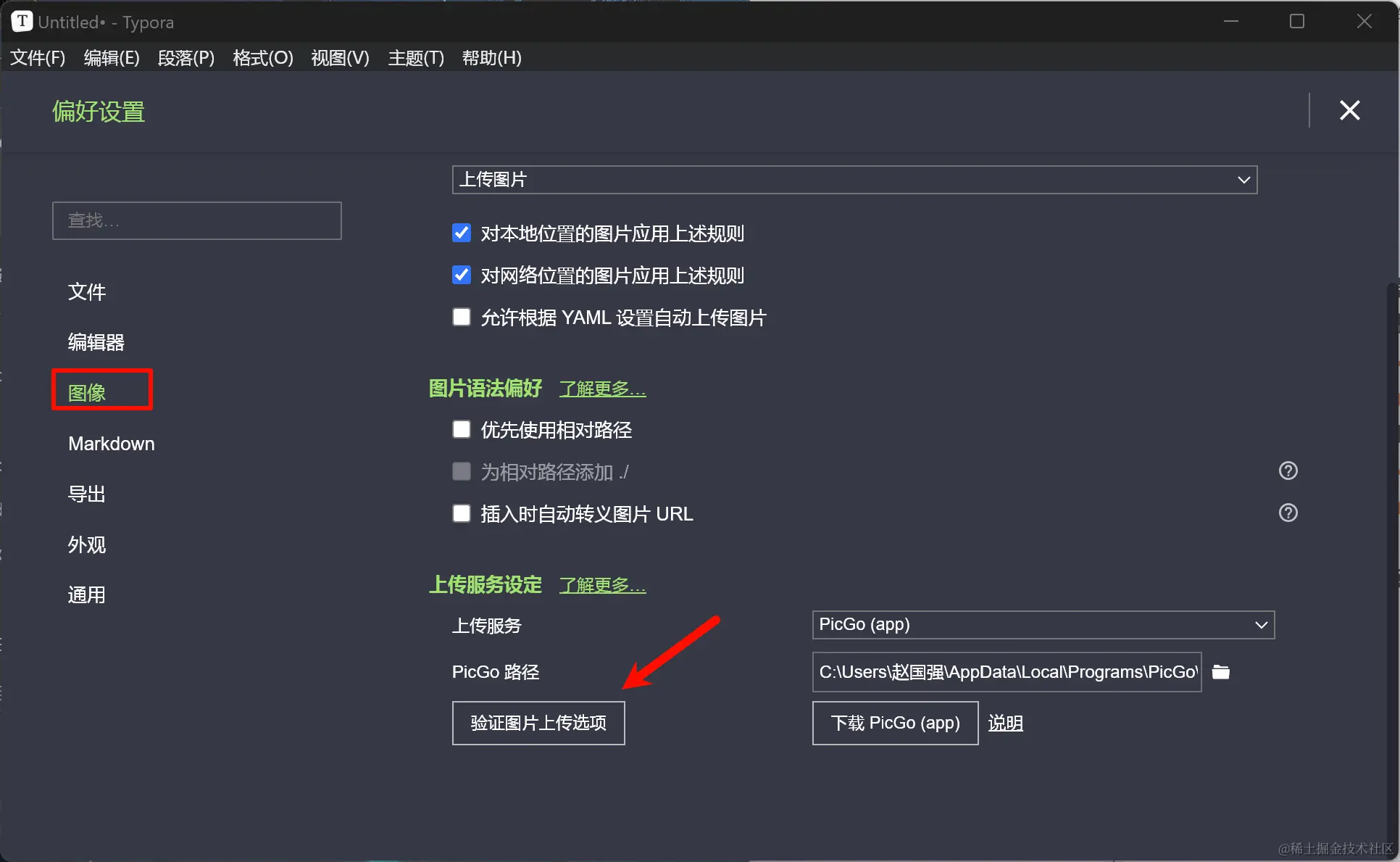 文件-偏好设置-图像,做如下选择,然后点击“验证图片上传选项”,看下是否成功。