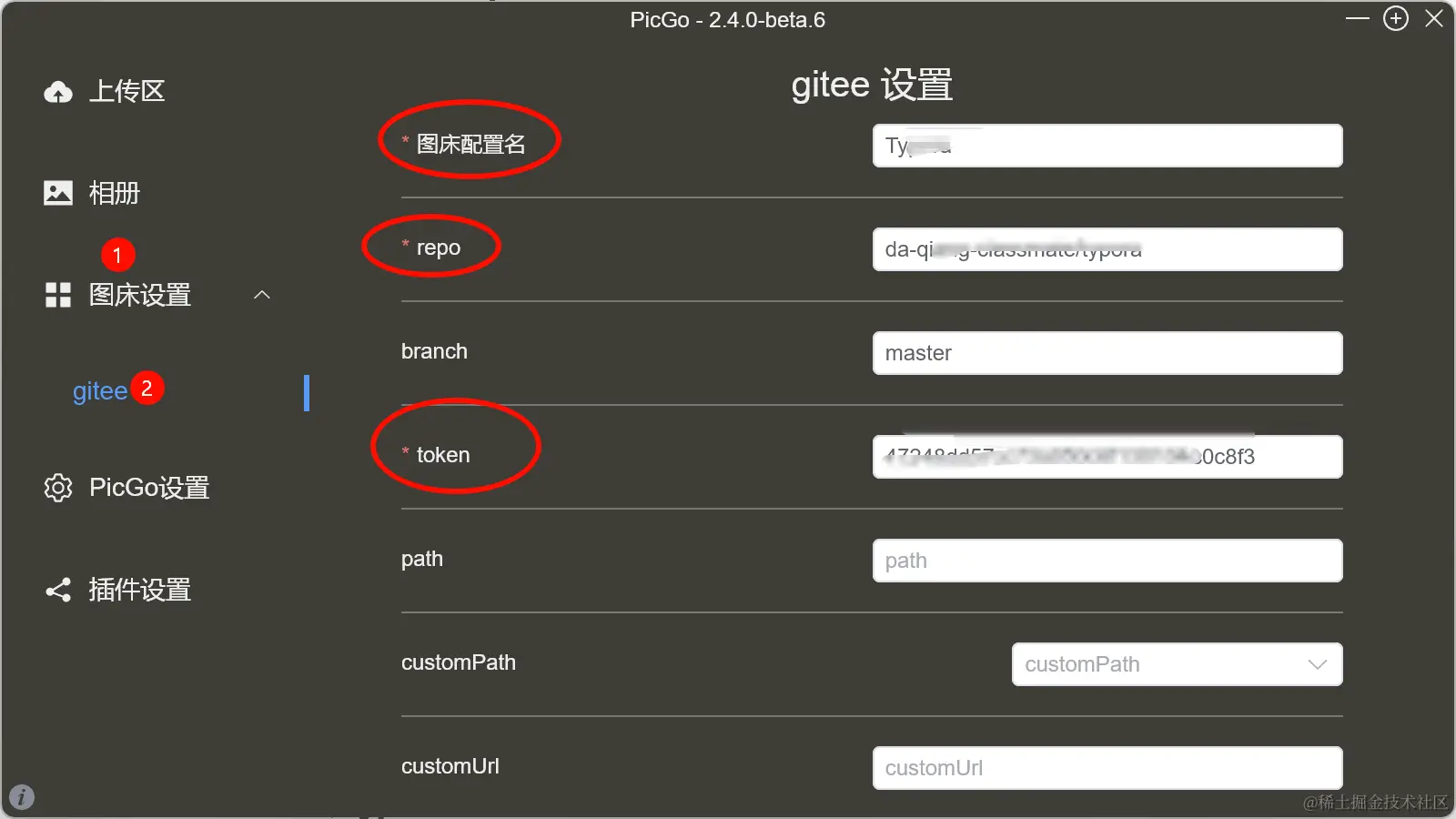 点击“图床设置”找到gitee,可以看到,需要填写3个参数,分别是:图床配置名、repo、token