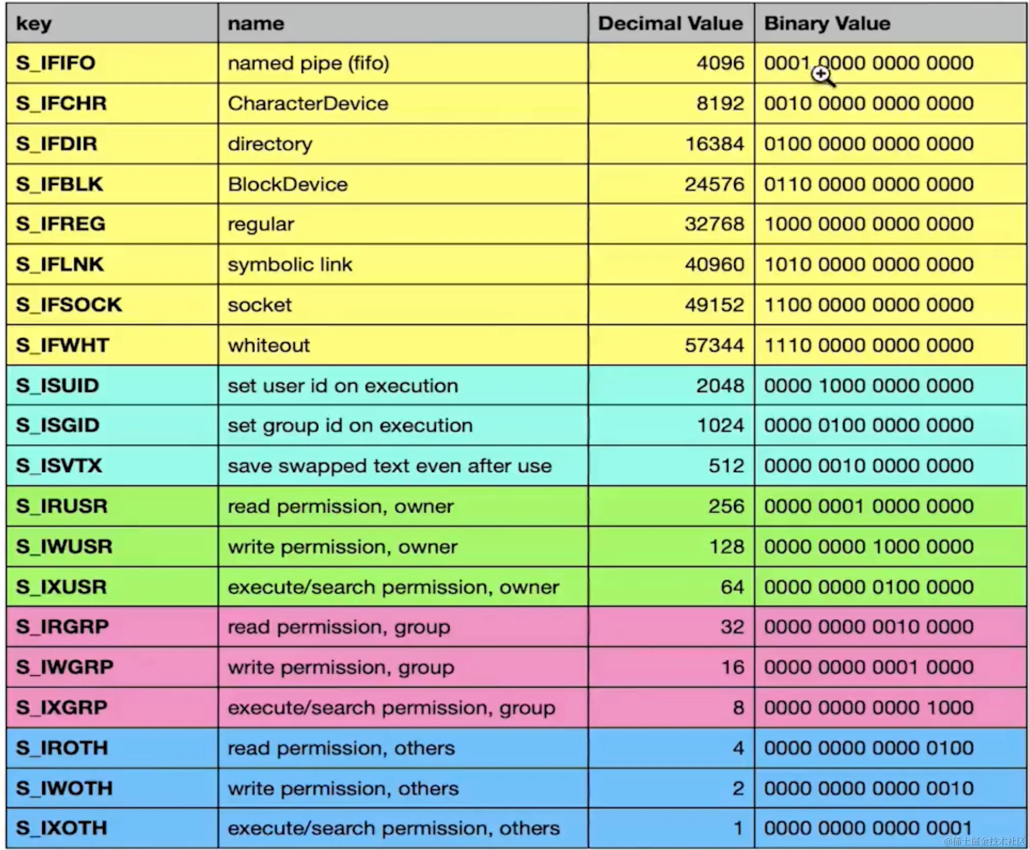 这个图像展示的是一系列Unix/Linux文件系统中的文件类型和权限标志,以及它们对应的十进制和二进制值。下面是每个名称的含义: