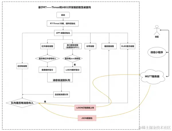 几个硬件设备都是分模块编写、耦合度较低,也较容易理解代码的用途。 整个软件的流程如下,主要是分为几个线程,通过RT-Thread来实现多线程的交互。网络端使用MQTT服务器来实现人机交互。