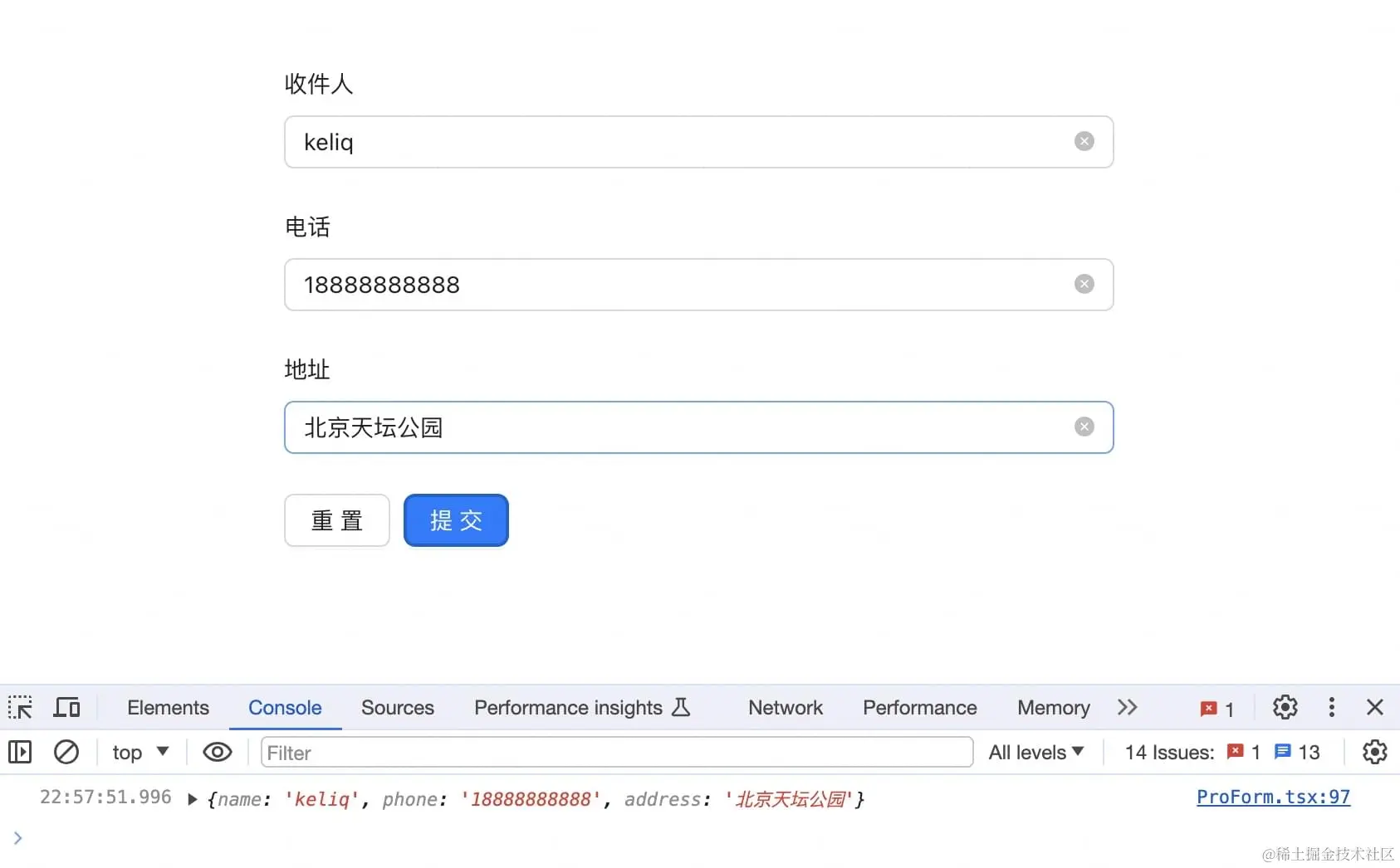 当填写用户名和密码之后,点击提交,此时打开控制台,就能看到 onFinish 回调函数中收集到的用户信息了: