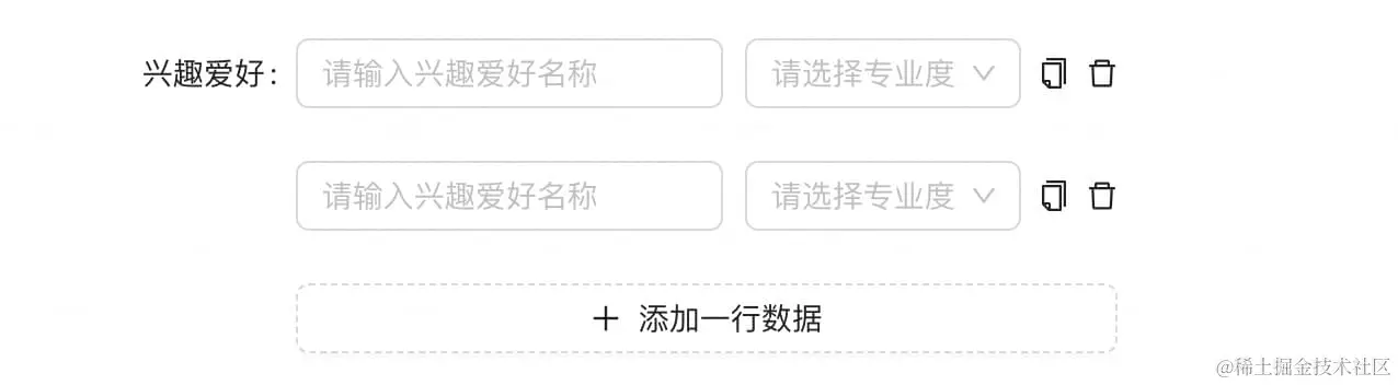 细心的同学肯定发现还缺少一项「兴趣爱好」,这个字段是一个数组,这个应该怎么做呢?有两种场景: