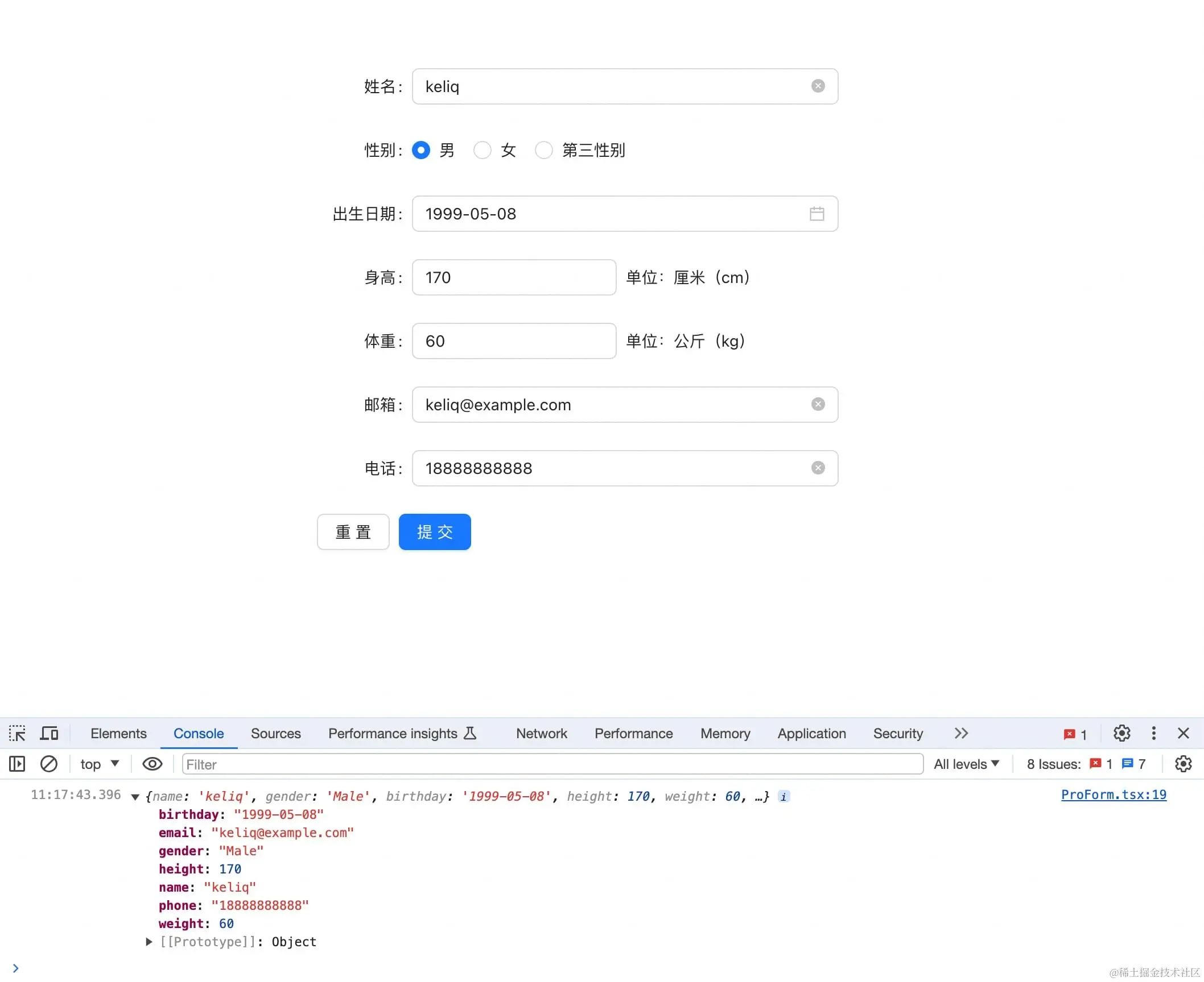 还真不是,实际业务中的表单肯定会比上面的用户名密码要复杂,例如产品提了一个用户信息收集的需求,需要获取用户的姓名、性别、出生日期、身高体重、邮箱电话、兴趣爱好等,接口希望传过去的数据格式如下: