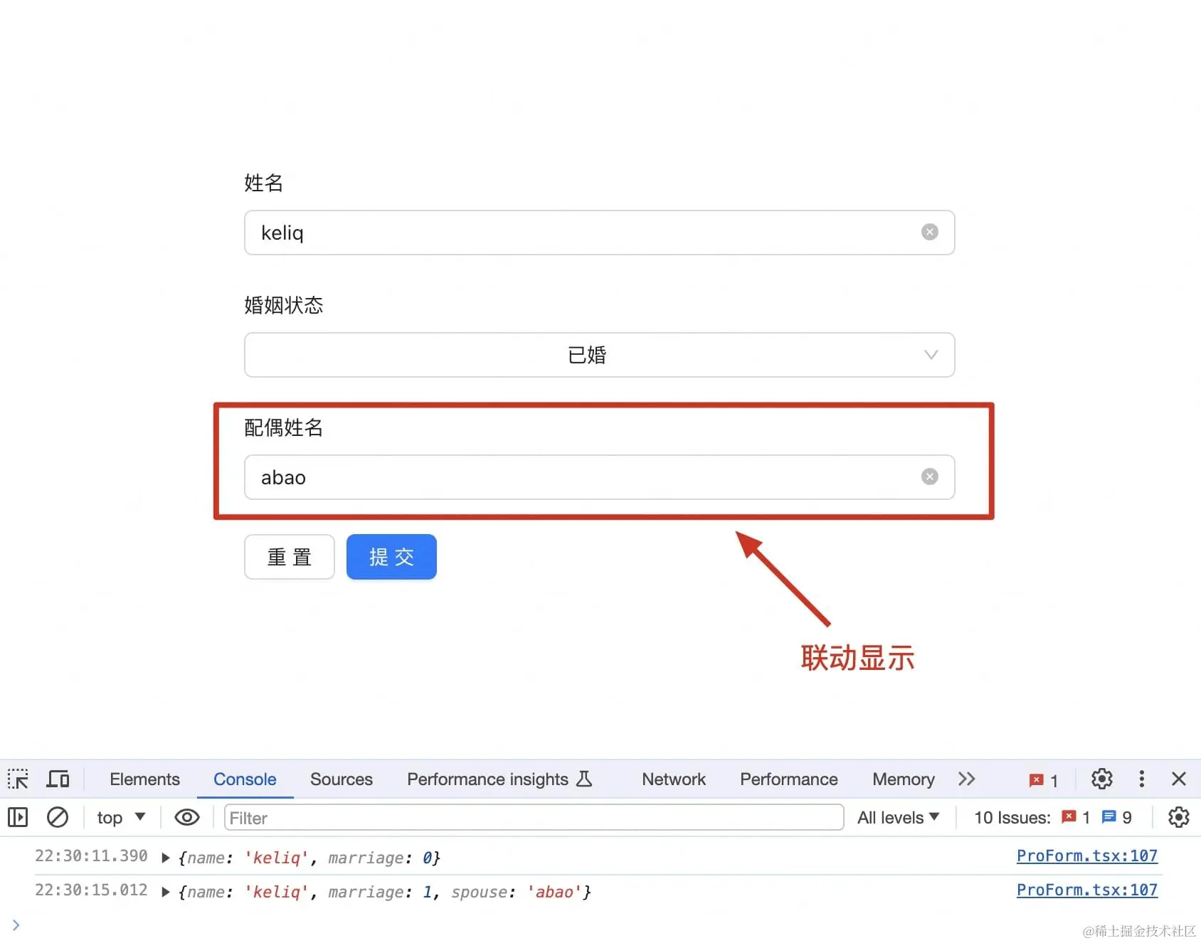 学会了如何在表单中收集数组项之后,我们再来增加一下复杂度:增加婚姻状态选项(未婚、已婚、离异、丧偶),如果用户选择已婚,在下面联动出现一个配偶姓名的表单项。