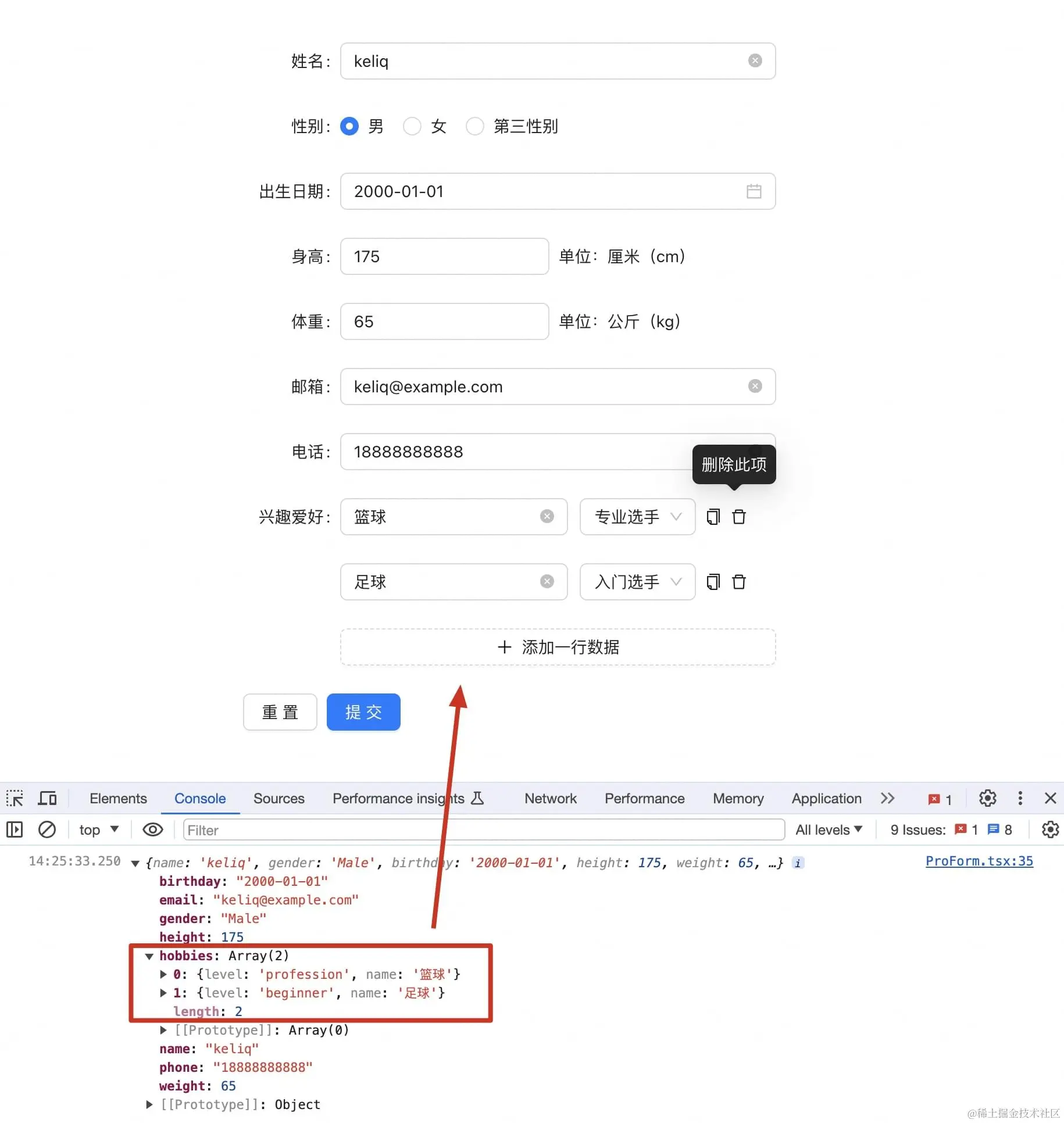放在 ProForm 表单中拿到的值是一个对象数组: