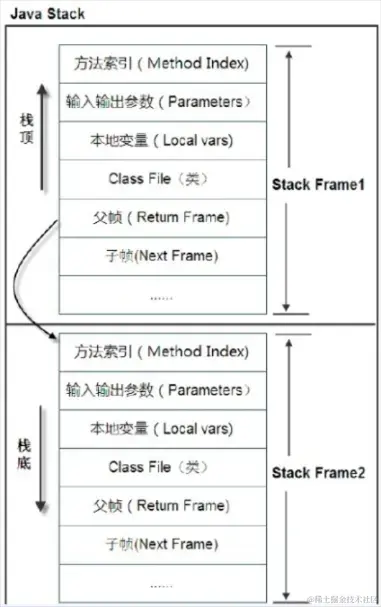 栈帧是一个内存区块,是一个数据集, 是 一个有关方法(Method)和运行期数据的数据集 ,当一个方法 A 被调用时就产生了一个栈帧 F1,并 被压入到栈中,A 方法又调用了 B 方法,于是产生栈帧 F2 也被压入栈,执行完毕后,先弹出 F2 栈帧,再弹出 F1 栈帧,遵循“ 先进后出 ”原则。 光说比较枯燥,我们看一个图来理解一下 Java 栈,如下图所示: