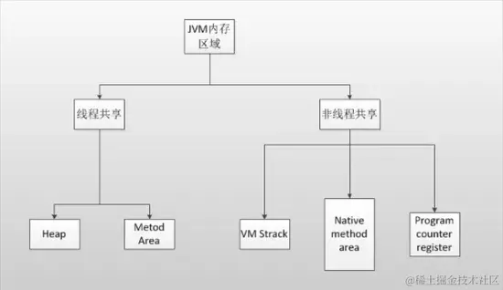 在此,你对JVM的内存区域有了一定的理解,JVM内存区域可以分为线程共享和非线程共享两部分,线程共享的有堆和方法区,非线程共享的有虚拟机栈,本地方法栈和程序计数器。