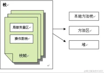 JVM栈由堆、方法区,栈、本地方法栈、程序计数器等部分组成,结构图如下所示: