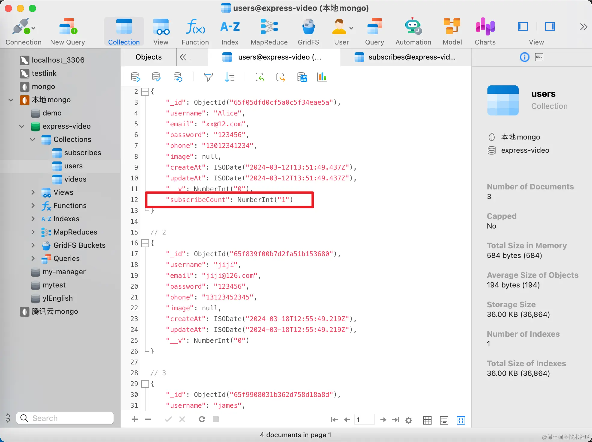 我们还需要在userModel文件中增加一个用于计数的字段,用于跟踪每个用户的订阅者数量: