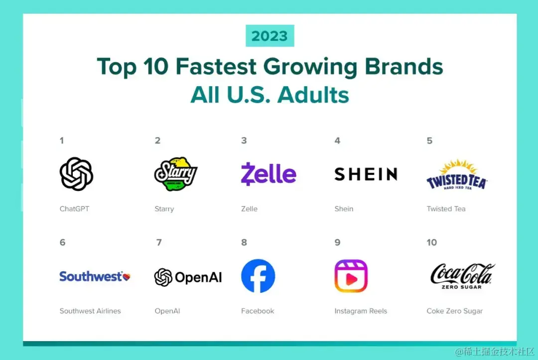 美国权威咨询公司Morning Consult发布的“全美十大增长最快品牌”榜单中,SHEIN与ChatGPT并列第四;在同期发布的“2023年千禧一代中十大增长最快品牌”子榜单中,SHEIN的排名仅次于ChatGPT。