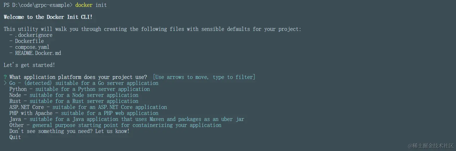 不过,Docker 官方为了降低使用门槛,推出了一个便捷的命令docker init。这个命令旨在快速初始化 Docker 配置,从而简化将 Docker 集成到项目中的流程。通过使用这个命令,用户可以轻松地为项目设置必要的 Docker 支持,进而享受到 Docker 带来的便利和效率提升。