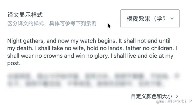 如果有学习英语需求的差友,我推荐你选择模糊效果。当鼠标移到译文上,译文才会展示出来。