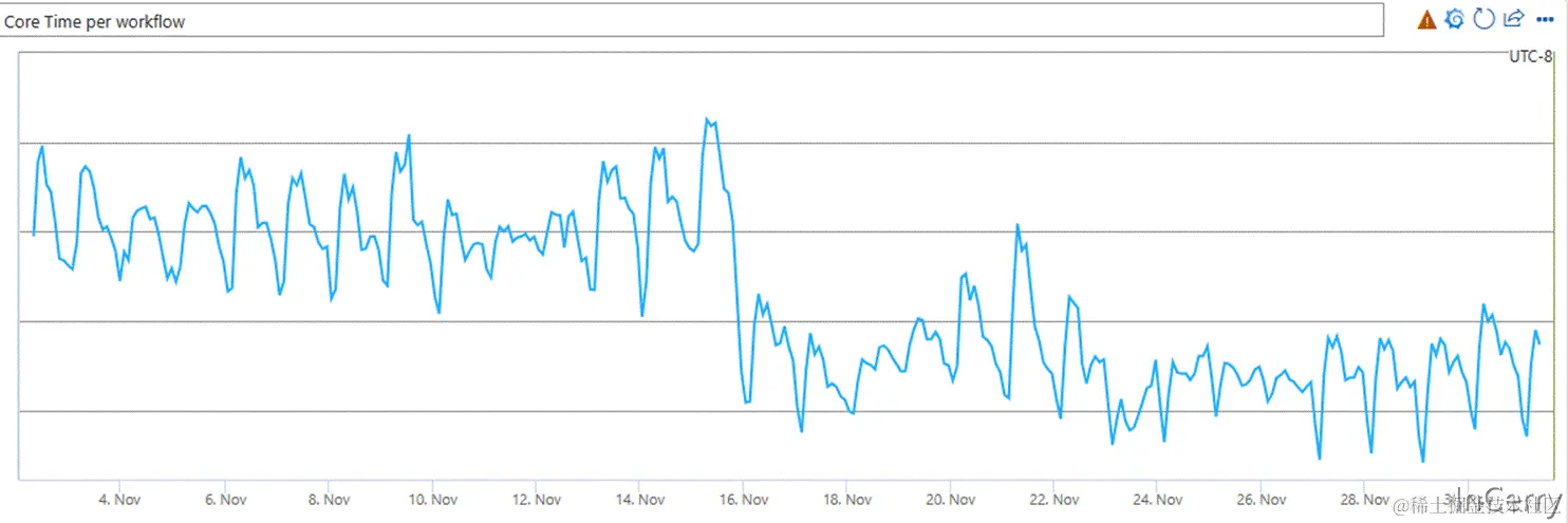 我们执行一个查询所消耗的CPU周期数减少了13%。换句话说,我们的效率提高了13%,或者再换一种方式表达:这意味着我们需要购买的机器数量减少了13%,以应对不断增长的需求。下面的图表显示了执行工作流程时总CPU时间的下降。