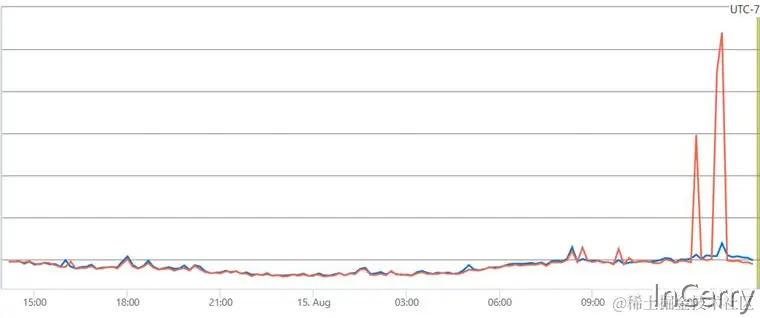 - 我们最大的工作负载在第一个用户查询时有一个小的延迟峰值,这表明要么有些方法根本没有编译,要么是因为分析的影响太大。这使得总延迟超出了最高限制。对于我们较小的工作负载来说,这不是问题。 下面的延迟图显示与基线相比,延迟有一个大幅度的峰值: