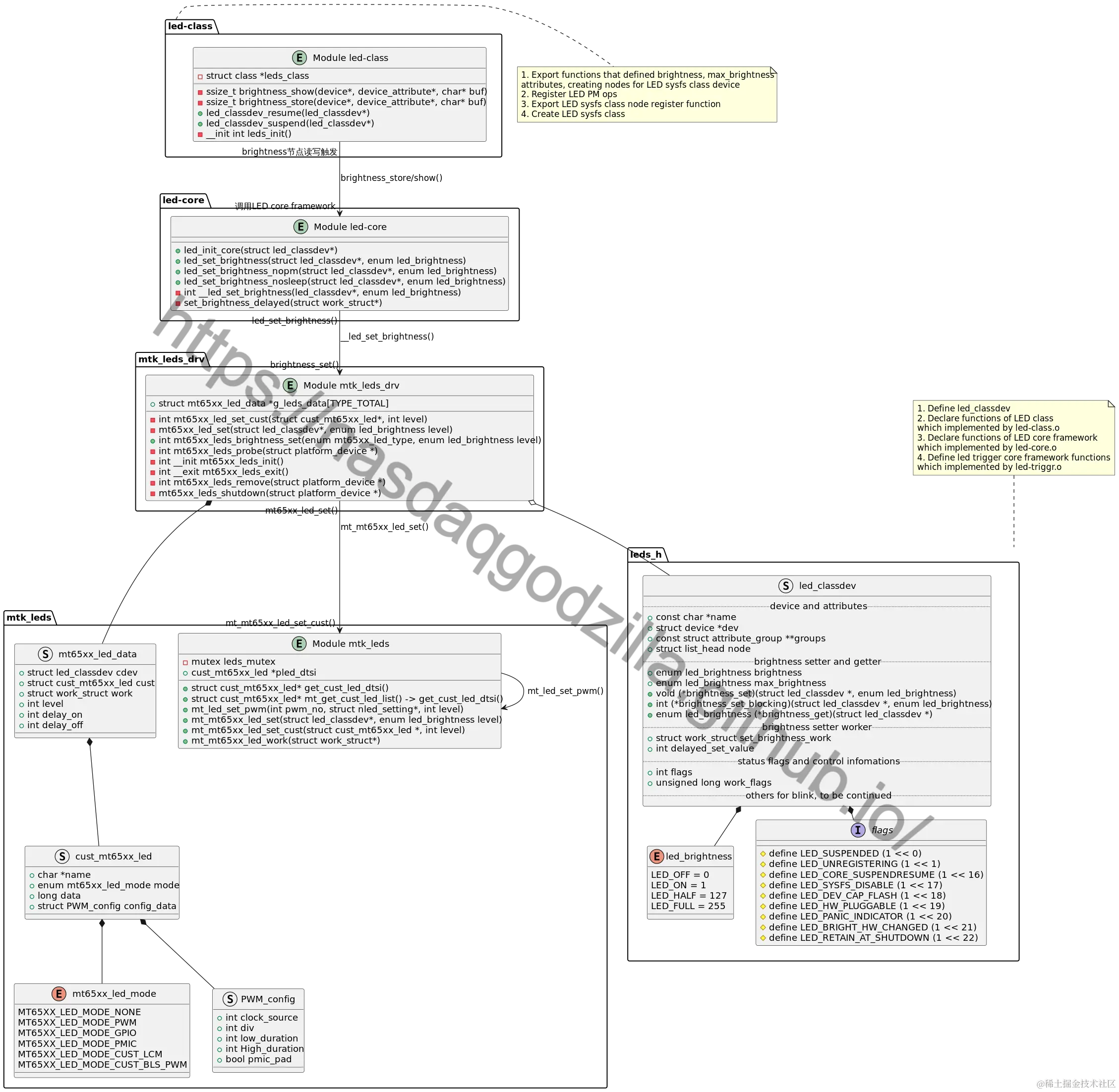 MTK LED采用了Linux LED sysfs class,它通过dts进行配置,借助built-in module的方式加载。其中,LED class提供了各LED设备的attribute来实现brightness、trigger等节点的创建,并将store、show等读写函数挂接到mtk_leds_drv.o这一真正的LED class device中,实现了LED节点的创建、读写流程。