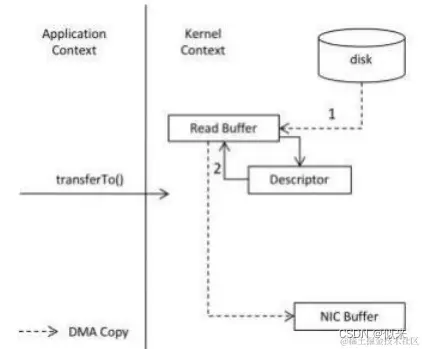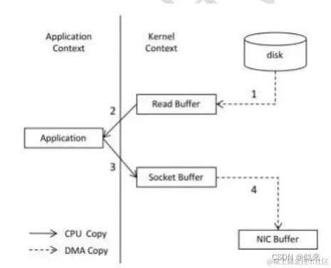在实际应用中,如果们需要把磁盘中的某个文件内容发送到远程服务器上,那么它必须要经过几个拷贝的过程。从磁盘中读取目标文件内容拷贝到内核缓冲区,CPU控制器再把内核缓冲区的数据赋值到用户空间的缓冲区中,接着在应用程序中,调用write()方法,把用户空间缓冲区中的数据拷贝到内核下的SocketBuffer中。最后,把在内核模式下的SocketBuffer中的数据赋值到网卡缓冲区( NIC Buffer)网卡缓冲区再把数据传输到目标服务器上。