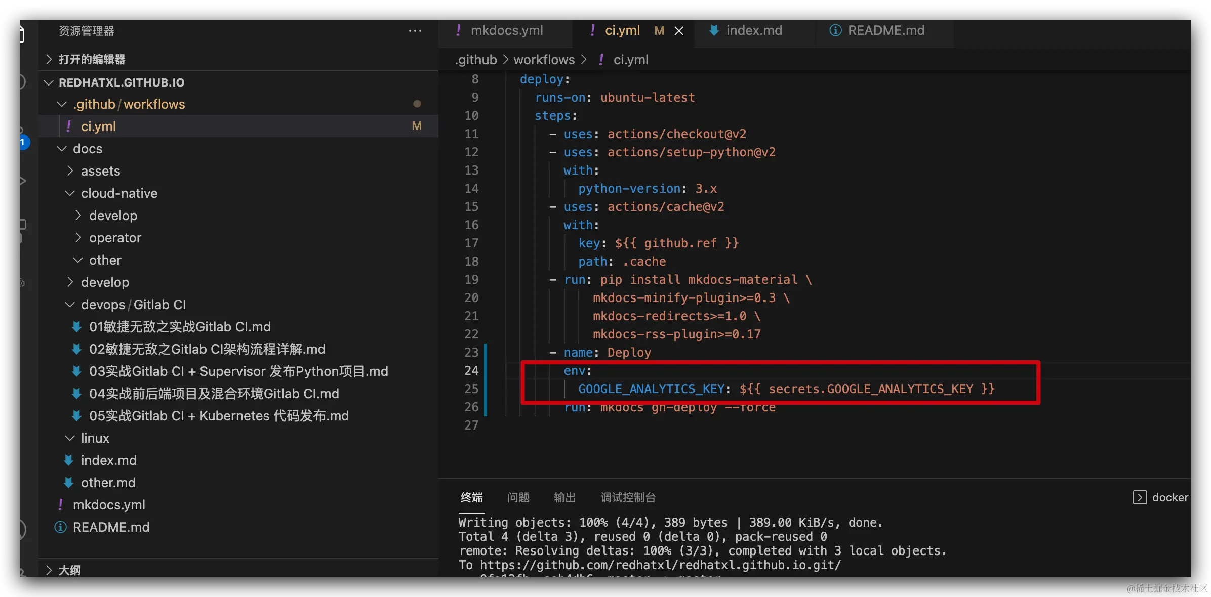 在 git 存储库中托管项目文档的好处是能够在推送新更改时自动部署它。 MkDocs 使这变得非常简单。